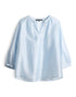 weite Passform, leicht ausgestellt geschnitten, leicht verkürzt geschnitten, 3/4 Arm, Rundhals mit V-Auschnitt, Rückenlänge ca. 62 cm bei Größe 36, Model Größe 175 cm – trägt Größe 36, Webware, enthält nichttextile Teile tierischen Ursprungs, dezente Struktur, leichter Stoff, leichte Transparenz, Kräuselung am Ausschnitt, Faltendetail am Ärmelsaum, Raglanärmel, Teilungsnaht an der vorderen Mitte, Perlmuttknöpfe