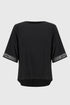 Dieses Jerseyoberteil definiert lässige Eleganz völlig neu. Der asymmetrische Saum steht im spannenden Kontrast zu der Boxy Silhouette. Das Zusammenspiel von U-Boot-Ausschnitt und Dreiviertelärmeln mit Mesh-Details setzt extravagante Akzente.