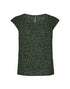 Viskose, Print aus kleinen, nebeneinander angeordneten Punkten, Schlitz mit Knopf hinten, überschnittener Kurzarm mit kleinen Raffungen, Schlitze in den Seiten, das Model ist 176 cm groß und trägt Größe 36