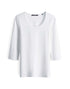 schmale Passform, figurbetont geschnitten, normale Länge, 3/4 Arm, Rundhalsausschnitt, Rückenlänge ca. 62,5 cm bei Größe 36, Modal Mix, Jersey, weicher Griff, Längsnaht hinten Material